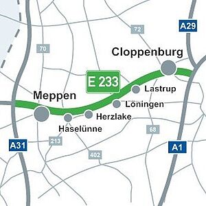 Die Planung zum Ausbau der ca. 8,2 km langen Trasse zwischen der Gemeinde Lastrup und der Stadt Cloppenburg beinhaltet zwei Anschlussstellen sowie zahlreiche Anpassungen und Ergänzungen von Verkehrsanlagen im nachgeordneten Straßen- und Wegenetz. Zudem bilden auf Basis aktueller Richtlinien und Vorgaben umfangreiche Untersuchungen der Lärmemissionen und des resultierenden aktiven Lärmschutzes einen sehr wichtigen Planungsbestandteil. So werden entlang der neuen E 233 etwa 9 km Lärmschutzwälle und -wände mit Höhen von bis zu 10 m notwendig. Der von uns geplante Ausbau ist ein Teil der insgesamt acht Planungsabschnitte über etwa 83 km Länge zwischen der A 31 (Anschlussstelle Meppen) und der A 1 (Anschlussstelle Cloppenburg).