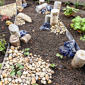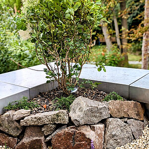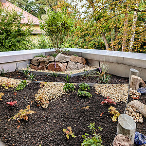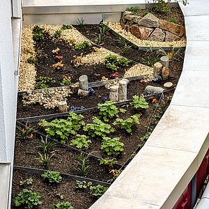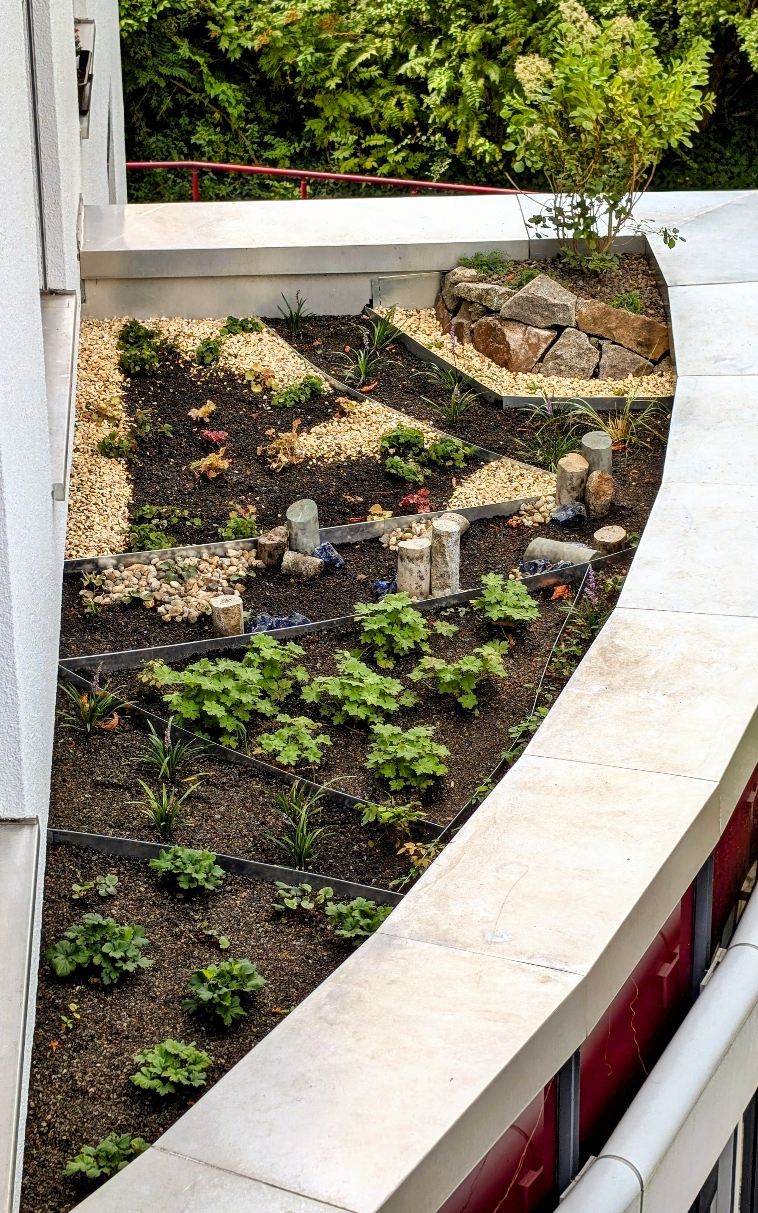 Dabei wurden auch Artefakte aus unserem fachlichen Dunstkreis mit verbaut. So zieren Bohrkerne aus früheren Baugrunderkundungen in Kombination mit Glasbruch und grobkörnigem Waschkies nachhaltig die Flusslandschaft auf dem begrünten Dach. Nun müssen sich die Anpflanzungen nur noch heimisch fühlen und dies durch Ausbreitung und Blüte auch noch kundtun.
