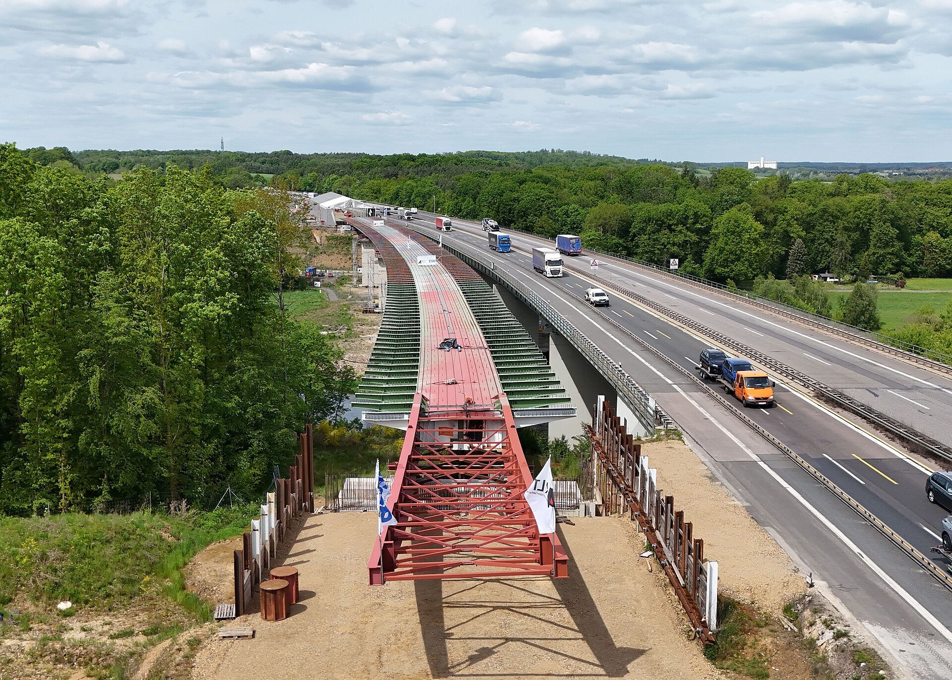 - Herstellungstechnologie: Taktschieben Stahlhohlkasten in Längsrichtung, Fahrbahnplatte aus Stahlbeton im Verbund, Schalungshilfen teilweise aus Halbfertigteilen, Querverschub südlicher Stahlverbundquerschnitt